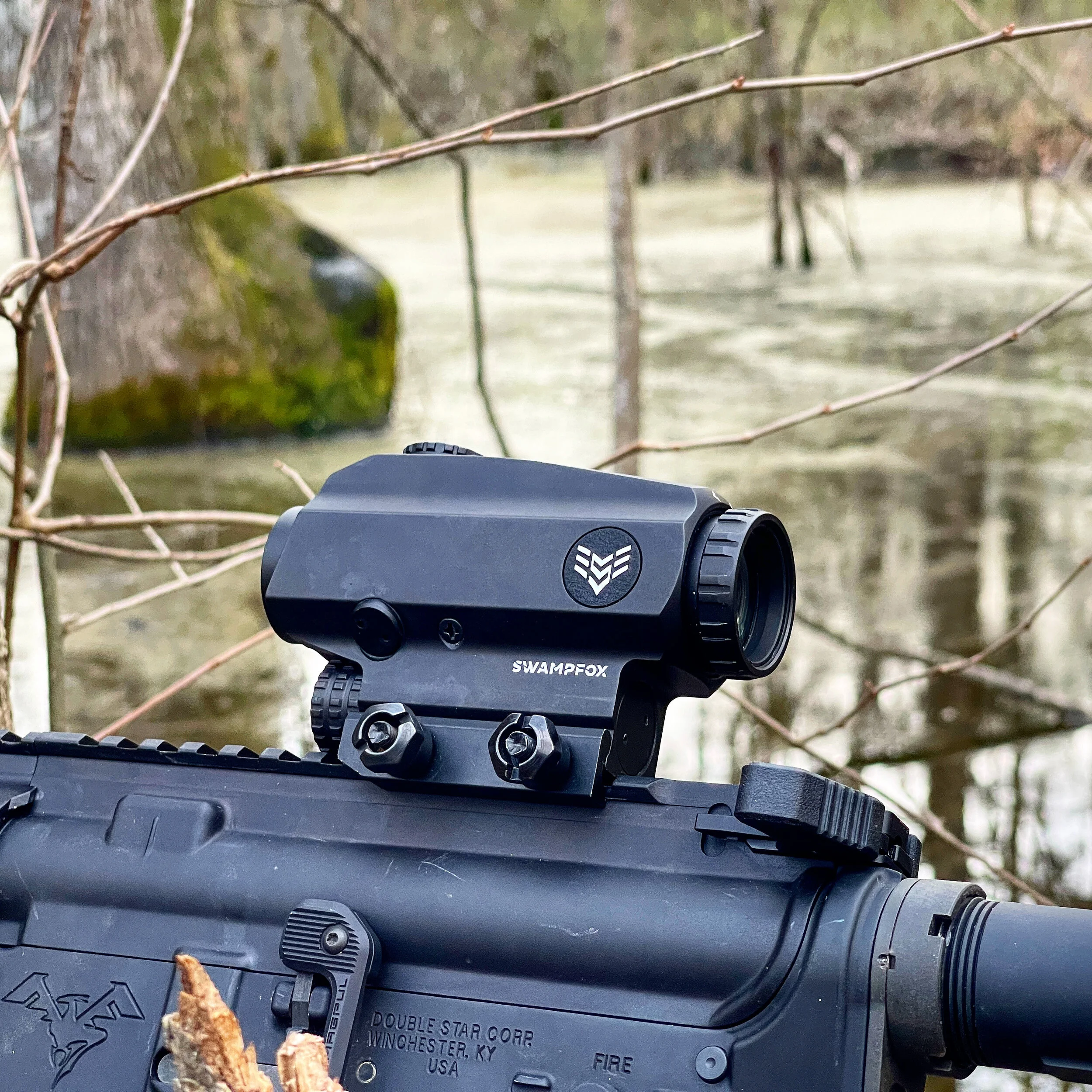 Swampfox made their entry into the prism scope category with a 1x they named “blade.” The blade features an etched reticle available in red, green or amber/gold illumination, shake awake and capped turrets. It has 10 brightness settings including 2 night vision compatible. Powering this optic is a CR123a. It’s rated for 800Gs and is 1 meter/IPX7 waterproof rated. It weighs in at 13oz. It’s a little tank on top of your weapon.